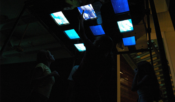 On both, ceiling and floor of the structure's device, there are reflective acrylic plates which reflect the participants found imersed in this environment, generating a mirrored relation and juxtaposing their images with the "electronic blue" of the screens, which is the base color proposed for the interactive animation. The images create a great blue mosaic, chained together they are arranged in possible oniric routes, which will be shared with other participants.