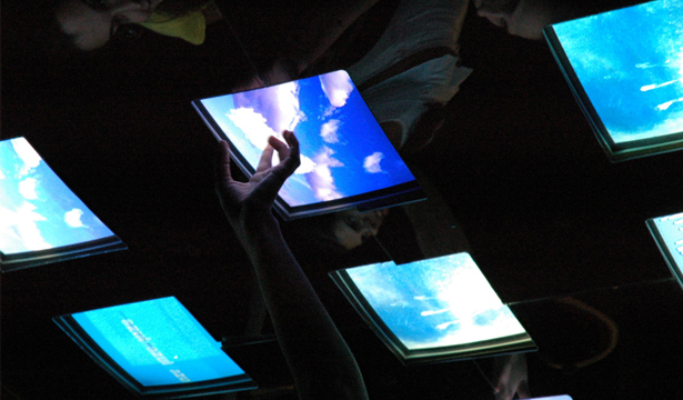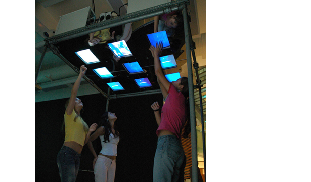 The device consists of 4 interactive terminals in a set of 9 monitors placed over the head of the participants, in which the navigation is done through the touch screen.