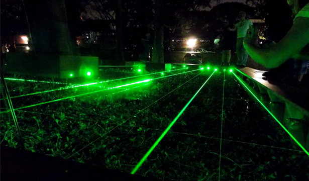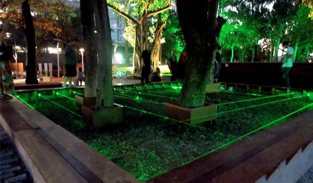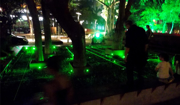 As soon as we stepped on the deck, a laser system turns on, trigged by sensors embedded on the deck itself, depending on the position and number of people walking on the structure, creating dialogue between participants and the environment. The virtual fabrics that form, redesign the visible yet inaccessible (due to contamination) green area, bringing a sense of wonder and displacement, a synaesthetic experience of pleasure and alert.