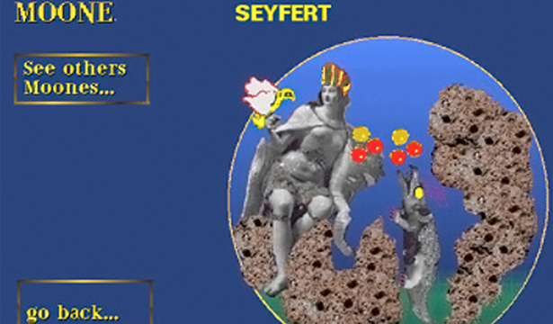 Procedure: 1- A space (circle) divided in two appears on the screen. 2- The two participants work alternately, one on the left side, the other on the right. 3- Each participant's work consists of making whatever he wants on his half of the screen (drawing, photo,..., any kind of digital image, taking into account the other's participation, thus establishing an dialogue in images. 4- A participant has access to only one half of the sphere. He can possibly take elements from the other side (for example by copying and pasting) but he can't intervene graphically in the composition of the other half. 5- After the intervention, the participant turns over the control of the screen to his partner. 6- As soon as the image is finished, the participants click on a "button" at which time: a: The center line disappears. b: The image is given the name of a crater on the dark side of the moon, using chance procedure. c: The image is saved (memorized). d: The image disappears. e: The blank screen is (again) ready for a new connection. 7- All the images made (this way) reveal a dark side of the moon, available in the form of an image bank, accessible by clicking on a "point" of the moon map created.