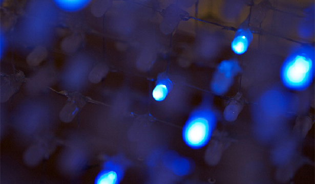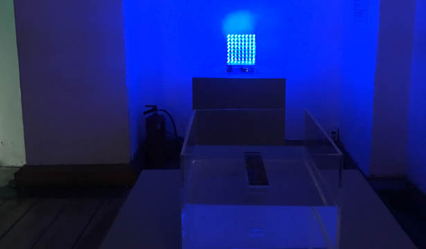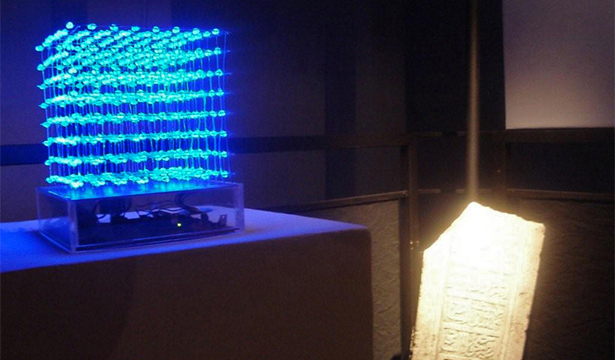 We have a virtual blue cube on the web with a stone on its base. Upon accessing it, the interactor writes a word and chooses a place to put it. The words can overlap, or combine with others spread and scattered around the cube. In the gallery, there is a virtual stone, inside a cube with blue LEDs (8X8X8), which responds to the interventions, varying with the intensity and frequency of light, according to the choices and nominations.