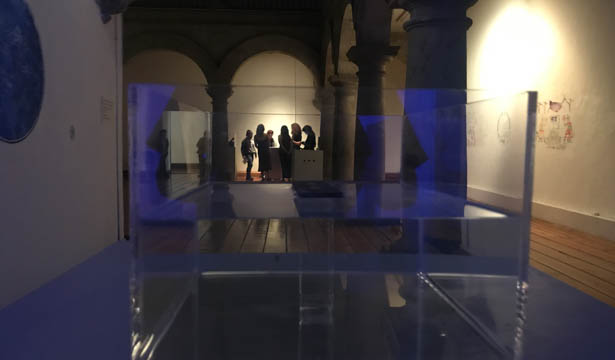 Beside the wall engraved with the Sky Circuit we have a Box with a “time ruler” submersed in water, representing the distance covered by stars in the period (1596-2018). This ruler was used to produce the work Sky Circuit, as measure of displacement of stars over time.