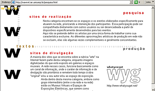 The wAwRwT project intends both to develop artistic work for the Internet as well as to reflect upon the technological poetics, focusing on the artistic-telematic dimension.